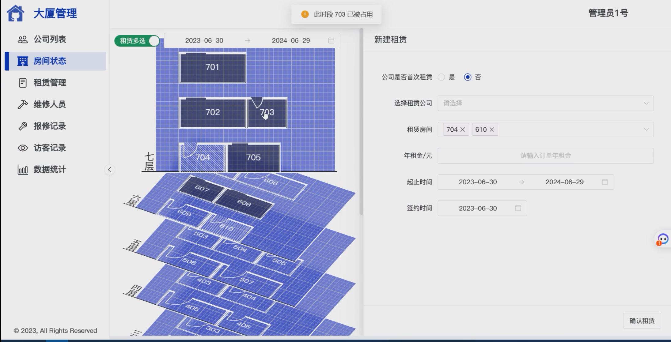 I developed a 3D schematic of the building’s rooms using css and vue techniques to simply visualize the rental of the building’s rooms and allow the user to easily delineate multiple rooms on the floor plan for rental purposes.